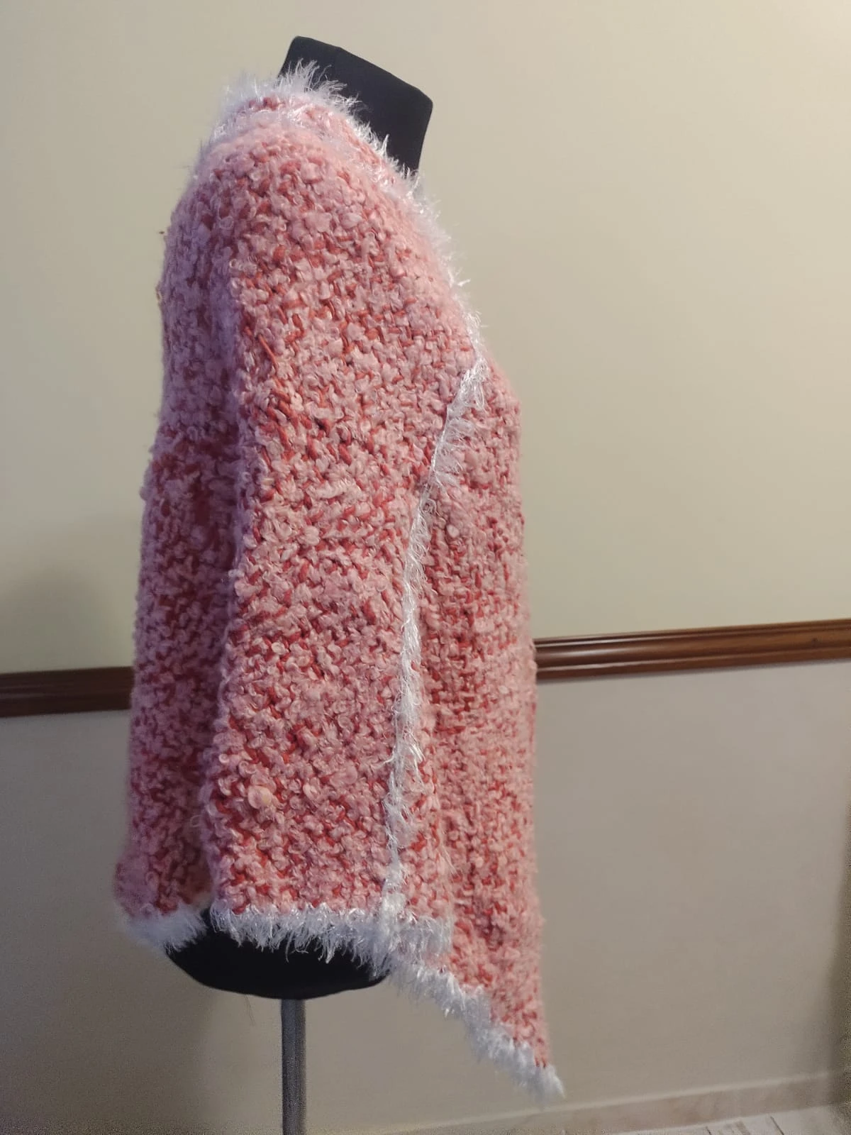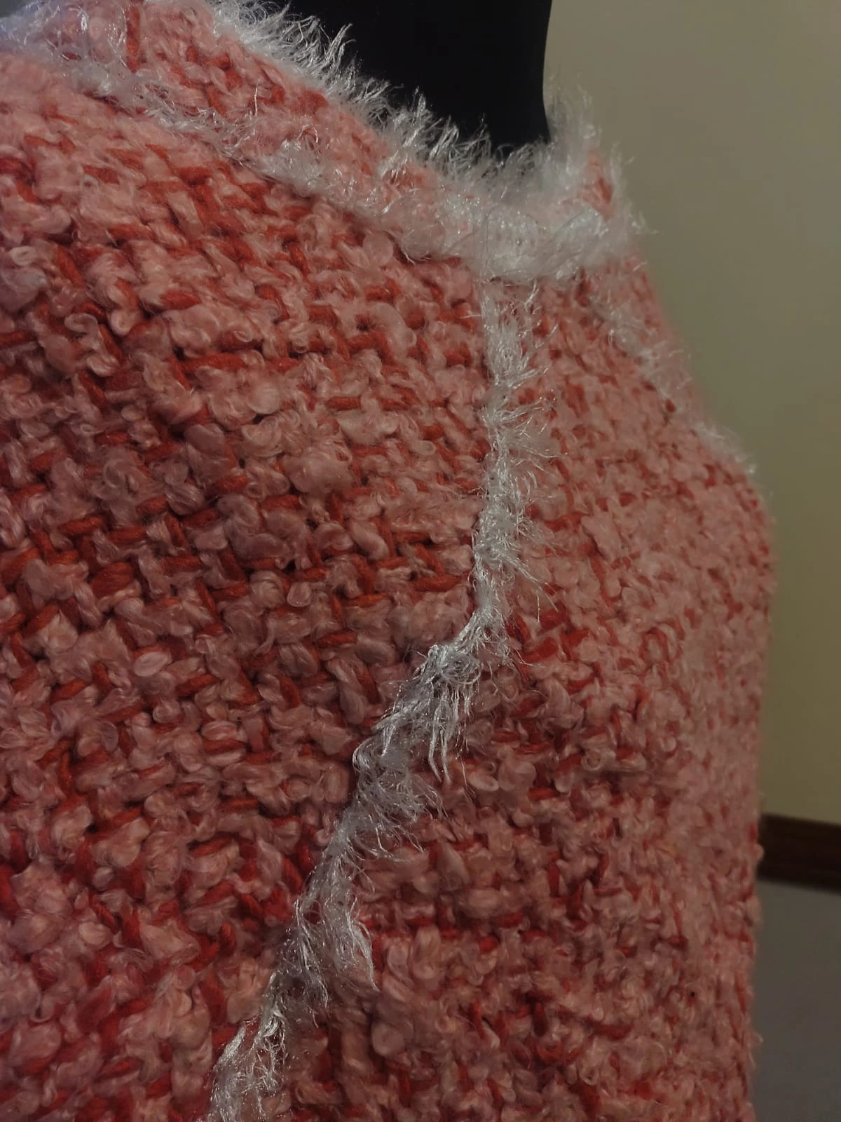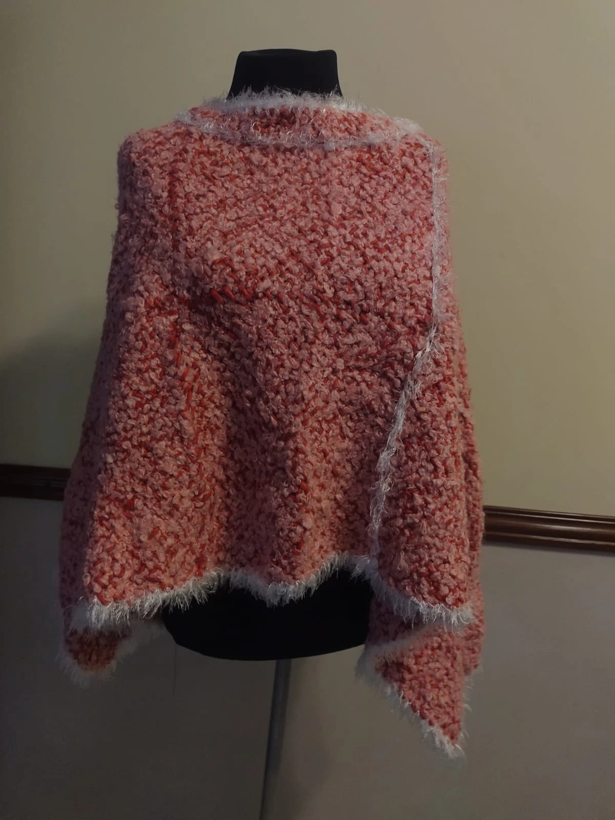 Tejido artesanalmente en TELAR DE CUADRADOS con una fusión de hilados únicos: lana bouclé, cashmilon y pelo de mono marca Cencherle.