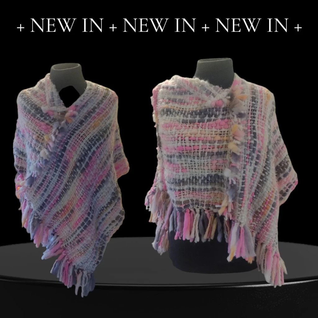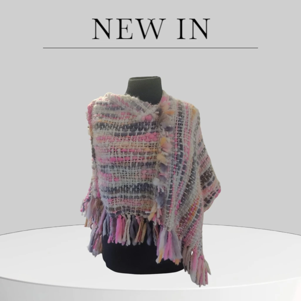 Tejido en telar de peine con una mezcla de lanas de cashmilon y flama de oveja que combinan rosa suave, crudo, blanco y gris, logrando un diseño delicado y moderno, ideal para lucir durante la tarde o en días frescos. 🌸☁️